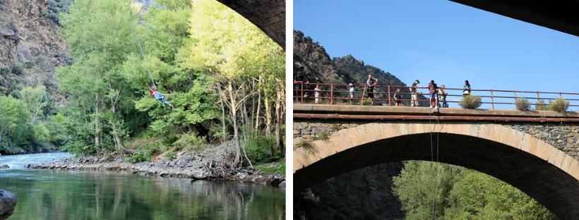 Aquesta activitat extrema a gran alçada consisteix en saltar al buit des d’un punt elevat i fixe, normalment un pont, amb l’única subjecció d’un arnés i d’una corda que lliguen a la persona pel tors o pel turmell amb el punt de partida del salt. Es practica de manera individual i està recomanada a persones atrevides i que vulguin viure emocions fortes. L’experiència és breu però molt intensa: si us atrau la idea de volar per sobre del riu de la Noguera Pallaresa, no dubteu en fer-la!