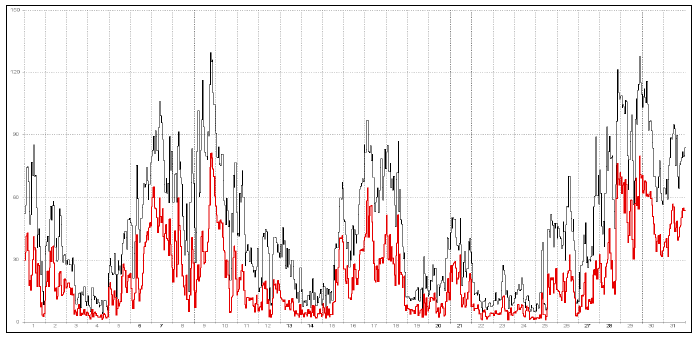 Velocitat del vent màxima (en negre) i mitjana(en vermell) durant el mes de desembre al FlowCapt de Fontnegra (2010 m).